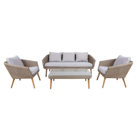 Aiamööblikomplekt NORWAY laud, diivan ja 2 tooli. Komplekti kõigi osade raamid on valmistatud alumiiniumist ja kaetud helepruuni plastikpunutisega. Alumiiniumist jalad on käsitsi värvitud tiikpuud meenutava bee˛i värviga. Istmepadjad kuuluvad komplekti. Padjakatted on valmistatud helehallist polüesterkangast. Laua mõõdud on 109x59xH38cm, lauaplaat: karastatud läbipaistev klaas. Diivani mõõdud on 182x79xH71cm, tooli mõõdud on 75×75,5xH71cm. Toode on muutlikes ilmastikutingimustes hästi vastupidav ja lihtsalt hooldatav. Kaitset ilmastikuolude eest vajavad ainult padjad. Välitingimustes kasutatava mööbli eluea pikendamiseks soovitame kasutada välimööbli katteid. HOIUSTAMINE: suvehooaja lõppedes soovitame aiamööblit hoiustada siseruumides. Puhastage ja kuivatage mööbel enne hoiule panekut. Kasutage hoiustamiseks kuiva ning hea ventilatsiooniga ruumi.