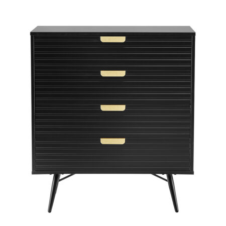 Kummut PIXAR 4-sahtliga 80x40xH90cm, must. Mööbliplaadist valmistatud kummut on viimistletud musta polüuretaanvärviga. Ribipaneelist sahtlite esipaneelid ning kuldsed käepidemed annavad kummutile pilkupüüdva välimuse. Kummuti jalad ja alusraam on valmistatud metallist.
