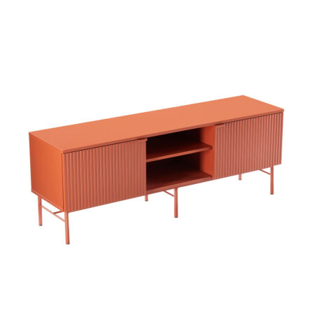 TV laud SEQUENCE 2-ukse ja avatud riiuliga 150x40xH55cm, sügispruun. TV laua korpus on valmistatud MDF plaadist. Reljeefse pinnaga triibulised uksepaneelid annavad lauale omanäolise ja trendika välimuse. TV laud on viimistletud vastupidava polüuretaanvärviga. Metallist alusraam ja jalad on viimistletud pulbervärviga.