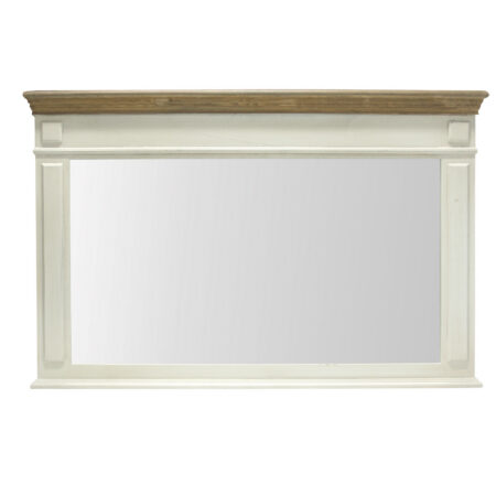 Peegel SAMIRA 107×4,5x70cm, antiikvalge/naturaalne. Peegli raam on valmistatud saarepuidust ja viimistletud antiikvalge värviga. Ülemine profiilliist on valmistatud naturaalses toonis paulownia puidust.