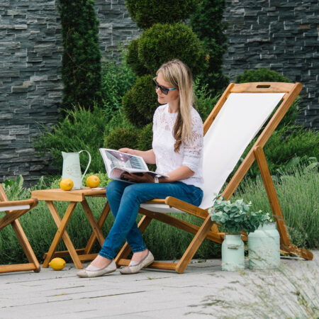 Lamamistool BALI 72x210xH36,5cm, bee˛. BALI sarja kuuluvaid tooteid iseloomustavad hoolikalt valitud eksklusiivsed materjalid, maitsekas värvikombinatsioon ja klassikaline disain. Tooli raam on valmistatud tiikpuust. Kõik puidust osad on peenlihvitud ja neid ei ole õlitatud ega muul viisil keemiliselt töödeldud. Iste ja seljatugi on valmsitatud bee˛ist batylinest. Batyline materjali kõige olulisem omadus on selle nõtkus ja optimaalne istumismugavus. Lisaks erakordsele mehaanilisele tugevusele on materjalil kõrge keemiline vastupidavus. Sünteetiline kate tagab ülikõrge ilmastiku- ja UV-kindluse. Batyline ei ima niiskust, tänu sellele kuivab materjal väga kiiresti ja on maksimaalselt pleki- ja hallituskindel ning lihtsalt puhastatav. Lamamistooli reguleeritava seljatoe saab panna horisontaalsesse asendisse või valida sobiv kaldenurk nelja positsiooni vahel. Lamamistooli üldmõõdud on 72x210xH36,5cm, istme ja seljatoe laius 65cm, istmeosa pikkus 135cm, seljatoe pikkus 75cm. Toode on muutlikes ilmastikutingimustes vastupidav ja lihtsalt hooldatav. HOIUSTAMINE: suvehooaja lõppedes soovitame aiamööblit hoiustada siseruumides. Puhastage ja kuivatage mööbel enne hoiule panekut. Kasutage hoiustamiseks jahedat, kuiva ning hea ventilatsiooniga ruumi.