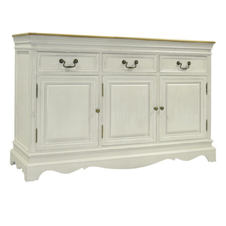 Kummut SAMIRA 3- sahtli ja 3-uksega 131,5x43xH87cm, antiikvalge/naturaalne. Kummuti põhikonstruktsioon ja sokkel on valmistatud saarepuidust, MDF küljepaneelid ja vaheriiulid. Kapp on viimistletud antiikvalge värviga. Pealmine MDF plaat on kaetud naturaalse paulownia spooniga. Kapil on 3 ilma siinideta sahtlit. Laiema, 2-uksega kapi poole sees on 1 vaheriiul. Kitsam, ühe uksega kapi osa on ilma vaheriiuliteta. Sahtlitel ja ustel on metallist käepidemed.