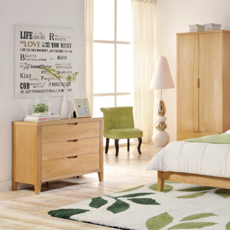 Kummut CHAMBA 3-sahtliga 90x45xH75cm. Kummuti karkass on valmistatud täispuidust. Pealmine plaat: 19mm MDF, küljepaneelid ja sahtlite esipaneelid: mööbliplaat. Kummut on kaetud naturaalse tammespooniga. Sahtlitel on metallist siinid.