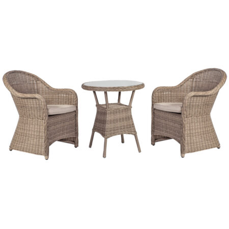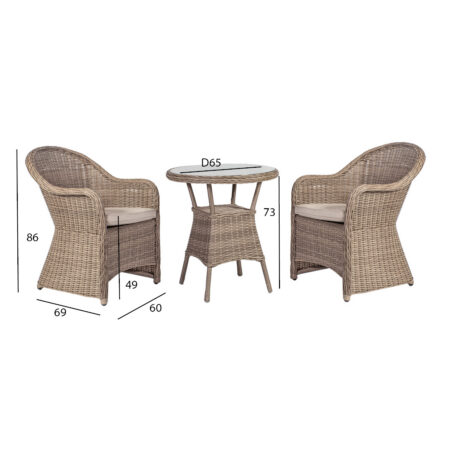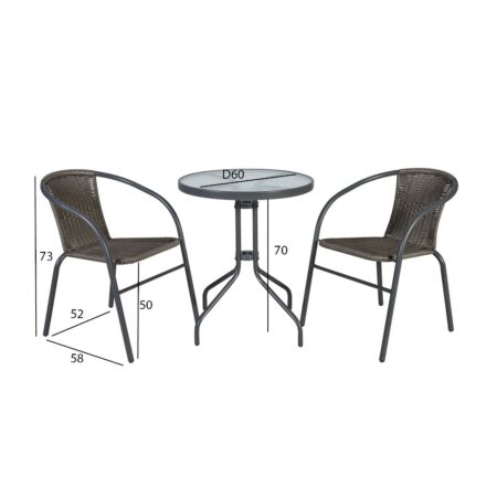 Aiamööblikomplekt WICKER laud ja 2 tooli, tumepruun. Laua mõõdud on 73x73xH71cm. Lauaplaat: 5mm läbipaistev karastatud klaas. Laua pulbervärvitud alumiiniumraam on kaetud plastikpunutisega. Tooli tugev ja stabiilne terasraam on kaetud plastikpunutisega. Istmepadi kuulub komplekti. Padja mõõdud 46x47x4,5cm. Padjakate on valmistatud polüesterkangast. Tooli üldmõõdud on 61x58xH86cm. Istme laius 46cm, istme sügavus 47cm, istme kõrgus 48cm. Käetoe kõrgus maast 62cm. Kaalupiirang 120kg. Toode on muutlikes ilmastikutingimustes hästi vastupidav ja ei nõua erilist hooldust. Välitingimustes kasutatava mööbli eluea pikendamiseks soovitame kasutada välimööbli katteid. HOIUSTAMINE: suvehooaja lõppedes soovitame aiamööblit hoiustada siseruumides. Puhastage ja kuivatage mööbel enne hoiule panekut. Kasutage hoiustamiseks kuiva ning hea ventilatsiooniga ruumi.