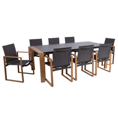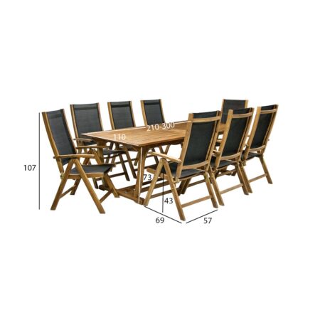 Aiamööblikomplekt FUTURE. Komplekti kuulub pikendatav laud ja 8 reguleeritava seljatoega kokkupandavat aiatooli. Laua mõõdud on 210/300x110xH73cm. Laud on keskelt pikendatav. Kaks keskelt kokku klapitavat 45cm laiust pikendusosa on paigutatud lauaplaadi alla. Pikendused on võimalik avada üksteisest sõltumatult vastavalt vajadusele. Laud on valmistatud akaatsia puidust ja viimistletud tiikpuu toonis puidukaitseõliga. Tooli mõõdud on 57x69xH107cm. Tooli raam on valmistatud akaatsia puidust ja viimistletud tiikpuu toonis puidukaitseõliga. Must textilene iste laseb hästi õhku läbi ja kuivavad kiiresti ja on lihtsalt hooldatav. Seljatoe reguleerimiseks tõstke käetoed üles, valige sobiv seljatoe asend ja fikseerige käetoed. Võimalik on valida 7 erineva positsiooni vahel. Kokkupanduna on tooli lihtne hoiustada ja teisaldada. Tooli mõõdud kokkupanduna 57x85x23cm. Istme laius 46cm, istme sügavus 46,5cm, istme kõrgus 43cm. Seljatoe kõrgus 69cm, käetoe kõrgus maast 63cm. Kaalupiirang 100kg. HOOLDUS: puit on elav looduslik materjal, mille välisilme ilmastikutingimuste mõjul muutub. Puhastage mööblit regulaarselt, kaitske liigniiskuse ja UV kiirguse eest. Kerge lihvimine ja uus õlikiht vähemalt korra aastas on piisav värskenduskuur mööblile jälle uue näo andmiseks. Välitingimustes kasutatava mööbli eluea pikendamiseks soovitame kasutada välimööbli katteid. HOIUSTAMINE: suvehooaja lõppedes soovitame aiamööblit hoiustada siseruumides. Puhastage ja kuivatage mööbel enne hoiule panekut. Kasutage hoiustamiseks kuiva ning hea ventilatsiooniga ruumi.