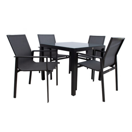 Aiamööblikomplekt AMALFI laud ja 4 tooli. Laua mõõdud on 90x90x74cm. Lauaplaat: 5mm karastatud klaas. Laua ja toolide jalad ja raamid on valmistatud alumiiniumist ja viimistletud halli pulbervärviga. Tooli textilene iste laseb hästi õhku läbi, kuivab kiiresti ja seda on lihtne puhastada. Toolid on virnastatavad ning nende hoiustamine on lihtne ja ruumi säästev. Tooli üldmõõdud on 58x65xH90cm. Kaalupiirang 120kg. HOIUSTAMINE: suvehooaja lõppedes soovitame aiamööblit hoiustada siseruumides. Puhastage ja kuivatage mööbel enne hoiule panekut. Kasutage hoiustamiseks kuiva ning hea ventilatsiooniga ruumi.