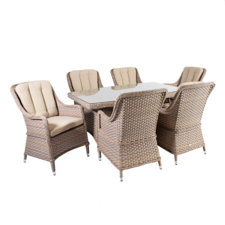 Aiamööblikomplekt EDEN laud ja 6 tooli. Laua mõõdud on 150x100xH74cm. Tooli mõõdud on 59x73xH95cm. Laua ja toolide raam on valmistatud alumiiniumist ja kaetud bee˛i plsatikpunutisega. Lauaplaat: 5mm karastatud läbipaistev klaas. Tooli padjad kuuluvad komplekti. Padjakatted on valmistatud bee˛ist polüesterkangast. Toode on muutlikes ilmastikutingimustes vastupidav ja väga lihtsalt hooldatav, kaitset ilmastikutingimuste eest vajavad ainult padjad. Välitingimustes kasutatava mööbli eluea pikendamiseks soovitame kasutada välimööbli katteid. HOIUSTAMINE: suvehooaja lõppedes soovitame aiamööblit hoiustada siseruumides. Puhastage ja kuivatage mööbel enne hoiule panekut. Kasutage hoiustamiseks kuiva ning hea ventilatsiooniga ruumi.