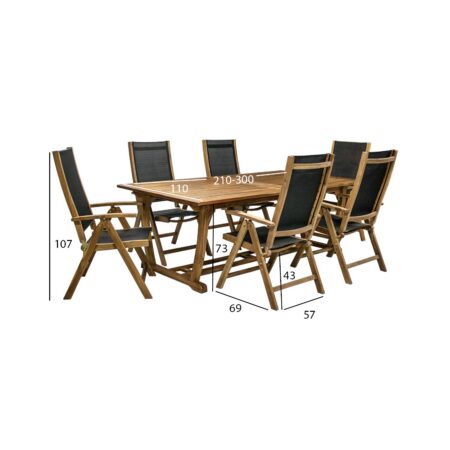 Aiamööblikomplekt FUTURE. Komplekti kuulub pikendatav laud ja 6 reguleeritava seljatoega kokkupandavat aiatooli. Laua mõõdud on 210/300x110xH73cm. Laud on keskelt pikendatav. Kaks keskelt kokku klapitavat 45cm laiust pikendusosa on paigutatud lauaplaadi alla. Pikendused on võimalik avada üksteisest sõltumatult vastavalt vajadusele. Laud on valmistatud akaatsia puidust ja viimistletud tiikpuu toonis puidukaitseõliga. Tooli mõõdud on 57x69xH107cm. Tooli raam on valmistatud akaatsia puidust ja viimistletud tiikpuu toonis puidukaitseõliga. Must textilene iste laseb hästi õhku läbi ja kuivavad kiiresti ja on lihtsalt hooldatav. Seljatoe reguleerimiseks tõstke käetoed üles, valige sobiv seljatoe asend ja fikseerige käetoed. Võimalik on valida 7 erineva positsiooni vahel. Kokkupanduna on tooli lihtne hoiustada ja teisaldada. Tooli mõõdud kokkupanduna 57x85x23cm. Istme laius 46cm, istme sügavus 46,5cm, istme kõrgus 43cm. Seljatoe kõrgus 69cm, käetoe kõrgus maast 63cm. Kaalupiirang 100kg. HOOLDUS: puit on elav looduslik materjal, mille välisilme ilmastikutingimuste mõjul muutub. Puhastage mööblit regulaarselt, kaitske liigniiskuse ja UV kiirguse eest. Kerge lihvimine ja uus õlikiht vähemalt korra aastas on piisav värskenduskuur mööblile jälle uue näo andmiseks. Välitingimustes kasutatava mööbli eluea pikendamiseks soovitame kasutada välimööbli katteid. HOIUSTAMINE: suvehooaja lõppedes soovitame aiamööblit hoiustada siseruumides. Puhastage ja kuivatage mööbel enne hoiule panekut. Kasutage hoiustamiseks kuiva ning hea ventilatsiooniga ruumi.