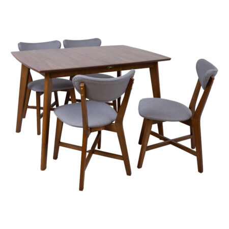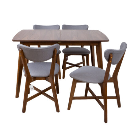 Söögilauakomplekt JESPER 4-tooliga. Lauaplaat: MDF naturaalse pähklispooniga. Laua jalad ja raam on valmistatud kummipuust. Laud on viimistletud pähkli toonis lakiga. Laud on keskelt pikendatav, 40cm lai keskelt kokku klapitav pikendusosa asub lauaplaadi all. Laua mõõdud on 120/160x80xH76cm. Tooli kergelt polsterdatud iste on kaetud halli polüesterkangaga. Tooli jalad ja raam on valmistatud kummipuust ja viimistletud pähkli toonis lakiga. Tooli üldmõõdud on 44x56x79,5cm. Istme kõrgus 45,5cm. Kaalupiirang 100kg.