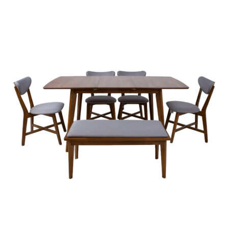 Söögilauakomplekt JESPER 4-tooli ja pingiga. Lauaplaat: MDF naturaalse pähklispooniga. Laua jalad ja raam on valmistatud kummipuust. Laud on viimistletud pähkli toonis lakiga. Laud on keskelt pikendatav, 40cm lai keskelt kokku klapitav pikendusosa asub lauaplaadi all. Laua mõõdud on 120/160x80xH76cm. Tooli kergelt polsterdatud iste on kaetud halli polüesterkangaga. Tooli jalad ja raam on valmistatud kummipuust ja viimistletud pähkli toonis lakiga. Tooli üldmõõdud on 44x56x79,5cm. Istme kõrgus 45,5cm. Kaalupiirang 100kg. Pingi kergelt polsterdatud iste on kaetud halli polüesterkangaga. Pingi jalad ja raam on valmistatud kummipuust ja viimistletud pähkli toonis lakiga. Pingi mõõdud on 92x40xH45cm.