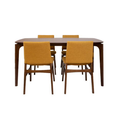 Söögilauakomplekt HAYDIE 4-tooliga. Söögilaua mõõdud on 150x90xH75cm. Lauaplaat: 18mm MDF naturaalse pähklispooniga. Jalad on valmistatud kummipuust. Laud on viimistletud pähkli tooni lakiga. Tooli mõõdud on 46x57xH79cm. Tooli iste ja seljatugi on kergelt polsterdatud ja kaetud kollase polüesterkangaga. Tooli jalad ja raam on valmistatud kummipuust ja viimistletud pähkli tooni lakiga. Kaalupiirang 120kg.