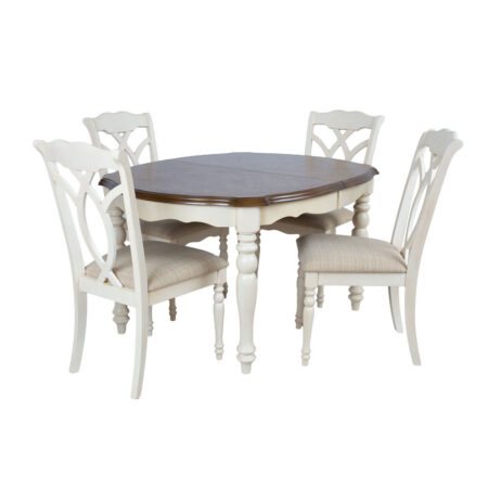Treitud jalad ja lauaplaadi alusraam on valmistatud kummipuust ning viimistletud antiikvalge värviga.